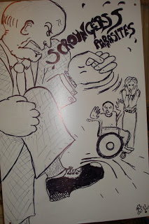 Only a few generations ago, in another recession, in another part of the world, people with disabilities and illness were called parasites too by a government propaganda machine. No one stood up and shouted. The government of the time felt vindicated and their second phase involved wide scale sterilisation. Again, very few people in the society of the time reacted. The government smiled and ticked the next box and we were the first to be exterminated. We, the disabled, were the canary in the coal mine. We still are.